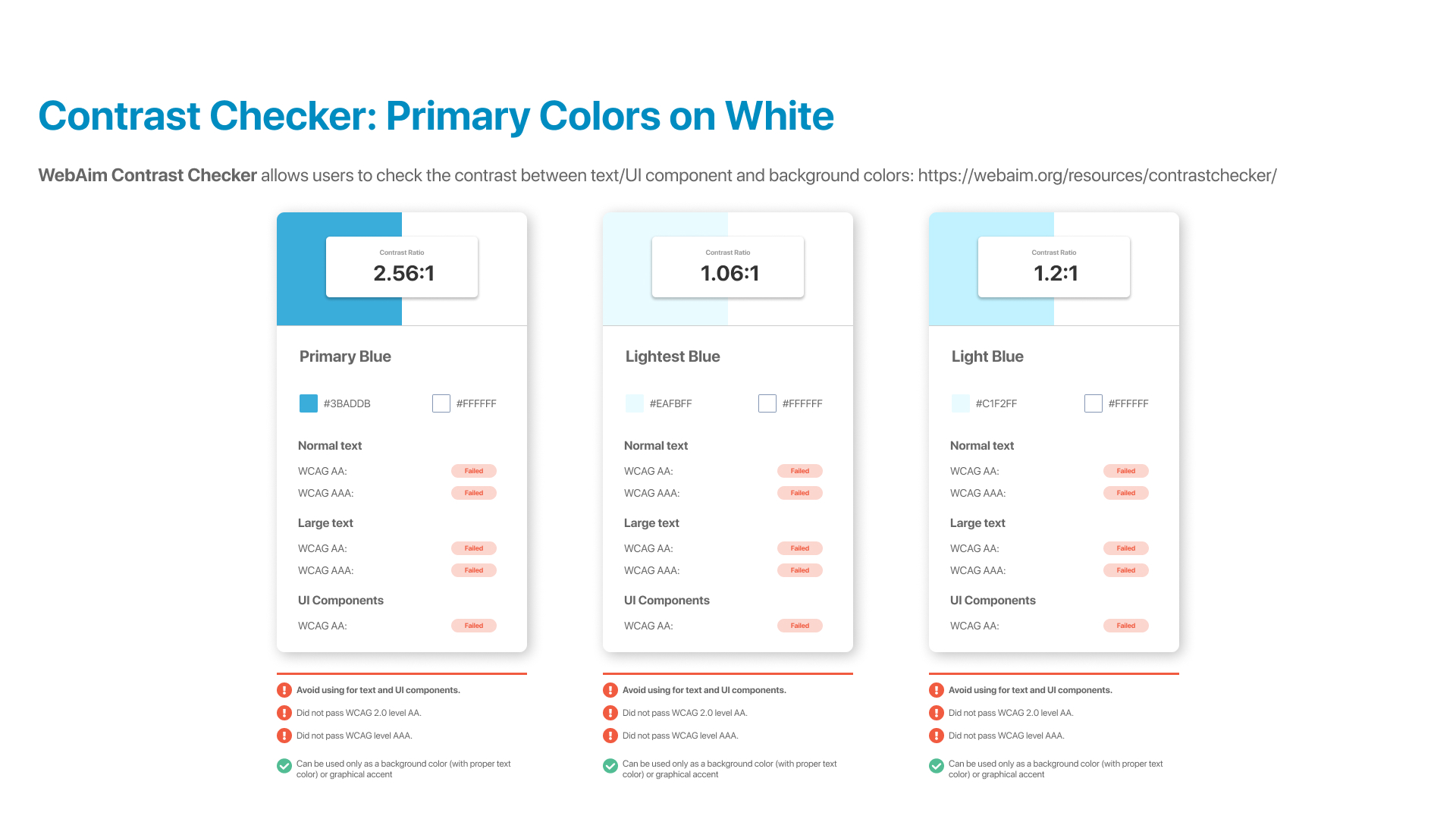• Color contrast (sufficient contrast between text and UI components and its background)